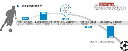 记者统计显示,在1992年瑞典举行的欧洲杯期间,上证指数上涨幅度为3.38%。1996年在英格兰举行的欧洲杯期间,上证指数上涨幅度为10.57%。2000年在荷兰和比利时举办的欧洲杯期间,上证指数上涨幅度为1.92%。2004年在葡萄牙举行的欧洲杯期间,上证指数下跌幅度为2.1%。到了2008年,在奥地利和瑞士举行的欧洲杯期间,上证指数下跌17.83%。