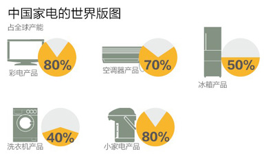 来自中国家电协会的数据表明,目前中国彩电产品占全球产能的80%,空调器产品占全世界产能的70%,冰箱产品占全世界产能的50%,洗衣机产品占全世界产能的40%,绝大多数小家电产品80%以上的产能也在中国,中国目前已经成为名副其实的世界家电生产中心。