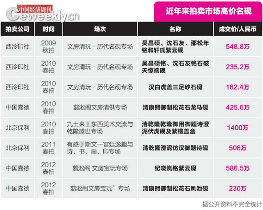 西泠印社拍卖有限公司的相关负责人告诉《中国经济周刊》,最受藏家追捧的还是那些“有故事”的名砚,比如在“西泠印社2012秋拍历代名砚专场”中,西泠印社创社四老之一的王禔缩刻石鼓文端砚实为文质并兼之佳作妙品。砚取长方平板式,光素文雅,石质细嫩,有大片透底蕉叶白,并有胭脂晕火捺与青花等石品,材质上佳,所刻石鼓文精细入微,小中见大,稳健凝重,不激不励,古意盎然。该砚估价在25万~35万之间,而最终成交价为66.7万人民币。