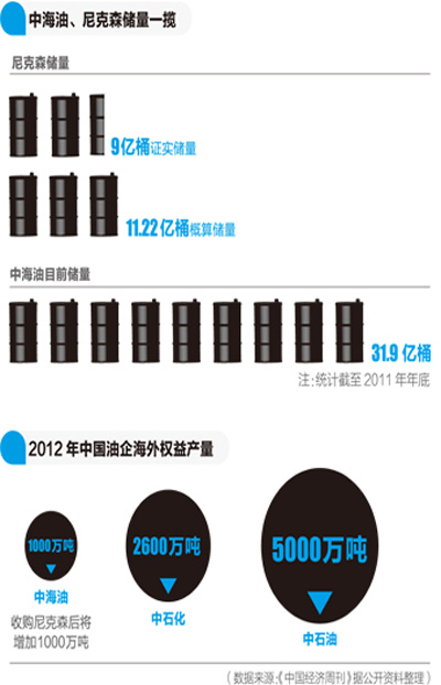 虽然成本巨大,但长远看来,中海油这次收购的利润也很丰厚。有媒体引用中石油经济技术研究院的报告称,中海油对尼克森的收购,将使其油气净产量较2011年增长22%,达到5500万吨,而其海外权益油气产量也将比2012年翻番,达到2000万吨。
