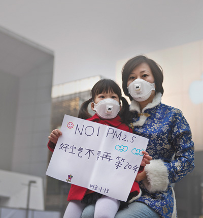 1月13日下午北京三里屯。空气污染严重,一个小女孩和她的妈妈手持小女孩写下的一句话:好空气不要再等20年。12岁以下的儿童、65岁以上的老人以及哮喘病患者都是对空气污染特别敏感的人群,应当格外注重自我防护。研究表明,PM2.5不仅可以增加儿童呼吸系统的患病率,还可降低儿童的肺功能和免疫功能。按照目前制订的时间表,北京需要20年的时间才能达到PM2.5年均35克/立方米的国家空气质量标准。公众期待早日迎来好空气。