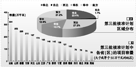 从区域分布来看,除东北地区以外(核准计划文件中指出黑龙江、吉林、内蒙古的核准计划另行研究),第三批核准计划中各区域分布较为均衡,其中华北671万千瓦,西北781万千瓦,分别占全国规模的23.4%、27.2%;华东规模为393万千瓦,华中规模为369万千瓦,南方规模为610万千瓦,分别占全国规模的13.7%、12.9%与21.2%。(见图2)