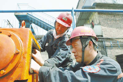 为确保设备“零隐患”运行,五一期间,岱河矿业公司2000余名职工放弃假日,坚守工作岗位。图为4月30日,该公司两名职工认真检修设备。