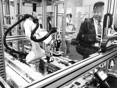 图为观众在现场观看该生产线作业。