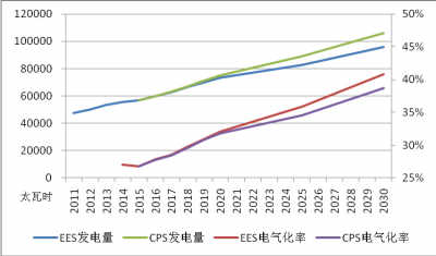 在CPS情景下,发电总量及发电量弹性系数偏高,而电力在终端能源消费中的占比(或电气化率)较低。然而,在EES情景下,发电总量及发电量弹性系数降低一些,但是,电气化率反则提升,因为二次能源转换率提升,终端生活和工业部门能源消费中的电力利用领域和范围更加广泛,从而终端能源消费更加清洁、环保、减排,更有利于建设低碳、环保和可持续的发展环境,实现“美丽中国”的目标。