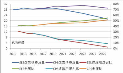 值得注意的是,在两种情景下,发电用煤在煤炭消费中的占比(即电煤占比)均逐年提升,终端用煤占比(指工业与生活终端用煤在全部煤炭消费中比重)逐年下降,两者之间形成消长关系。尤其在EES情景下,电煤占比上升速度快于CPS情景,终端耗煤占比下降速度又快于CPS情景。在此情形下,煤炭的清洁高效利用必将对节能减排作出更大的贡献。