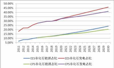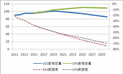 在上述两种情景下,非化石能源占一次能源消费比例和非化石能源发电占发电量的比例均逐年增加。其中,CPS情景下的非化石能源占比较低,提升较慢,到2030年仍可达到20%左右的政策目标;而EES情景下非化石能源的占比更高,增速较快,到2030年非化石能源占比达到24%,比CPS情景高近4个百分点。非化石能源发电的占比在EES的情景下,增长更为突出。仅就非化石能源的一次能源占比看,可提前四年左右实现中国对外承诺的政策目标。我们认为,这是一个带政策条件、却可努力实现的目标。