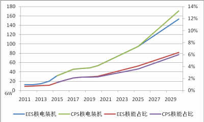 核电也是中国能源供应和能源转型中不可忽视的重要一环,并在2030年非化石能源占比目标中发挥作用。其中在CPS情景下,到2030年核电规模可达171GW(按此装机容量,将相继超过日本、法国和美国,成为世界第一核电大国),核能占比6.0%;而EES情景下的核电规模为153GW,核能占比6.3%。我们认为,后者的核电装机增长相对稳健,但是2015年必须起步,2020-2025年为快速建设期(每年投建8-10台机组)。但是,如何形成与上述核电发展规模相适应的核电综合实力、民族品牌和核电文化,是重大挑战。