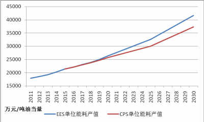 推动能源转型的另一重要途径是能源效率。显然,我们对EES情景下的能源效率做了较高的假设(见表1),并认为在持续推动以上海外高桥第三发电股份公司的2台百万千万机组的276克/度或新机组251克/度为代表的国内先进燃煤发电效率、三大产业能耗和能源消费结构调整上是可以实现的。因此,单位油当量能耗的产值高于CPS情景下的产值。到2030年,CPS情景下的每吨油当量产值(以2011年不变价格计算)为37306元;而EES情景下,这一产值可达到41626元,比前者高近10%。