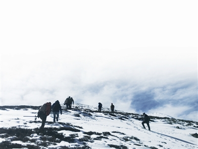 八点多集合出发,身背仪器,手拿拐杖,带上干粮和一壶热水,穿行雪域高原。山上积雪最深已达30厘米至50厘米,鞋子里面不时渗入雪,脚冻得发僵。晚上六七点再回到冷冰的营地,总结当天的、安排第二天的工作,就是他们寻常的一天。