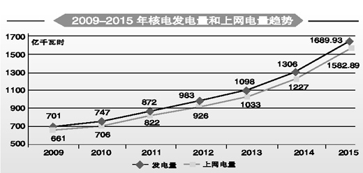 本报讯 中国核能行业协会日前发布的《2015年1-12月全国核电运行情况》显示,2015年1-12月全国累计发电量为56184.00亿千瓦时,核电累计发电量为1689.93亿千瓦时,约占全国累计发电量的3.01%。核电累计发电量比2014年同期上升了29.42%;累计上网电量为1582.89亿千瓦时,比2014年同期上升了29.02%。其中,第四季度(10-12月)全国发电量为14023.90亿千瓦时,核电发电量为440.64亿千瓦时,约占第四季度全国发电量的3.14%。与燃煤发电相比,2015年核能发电相当于减少燃烧标准煤5373.98万吨,减少排放二氧化碳14079.82万吨,减少排放二氧化硫45.68万吨,减少排放氮氧化物39.77万吨。