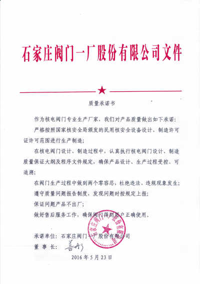 作为核电阀门专业生产厂家,我们对产品质量做出如下承诺: