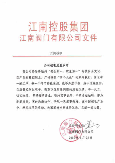 河南开封高压阀门有限公司为核电项目提供产品和服务,始终奉行“质量第一,用户至上”的企业精神和“核电无小事”的思想理念,为确保核电产品设计、生产制造过程及最终产品符合核安全质量要求,公司郑重承诺如下:
