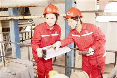 日前,75吨燃煤锅炉注汽站员工周叶(左一)、邹晓娜在测量送风机的电机温度和震动值,保证锅炉经济平稳运行。