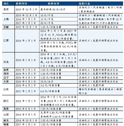 近期国家相关部门向各重点区域、重点行业分解VOCs下降、减排任务。目前,北京、上海、安徽、江苏、河北、湖南、四川、辽宁、天津、山东、浙江、海南、山西、湖北、福建等15个省、直辖市,陆续公布了排污收费标准。