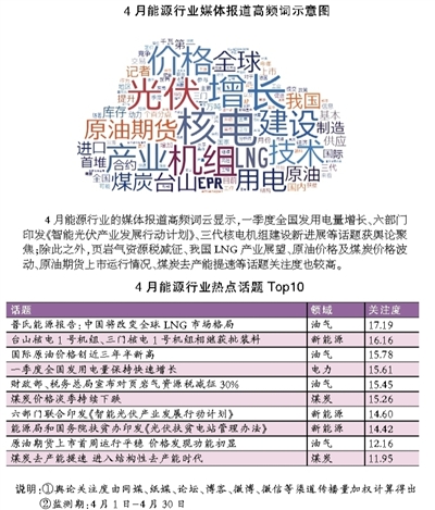 人民网舆情数据中心通过梳理4月能源行业十大话题、能源领域精彩言论、热门能源企业以及新近出台的能源行业新规新政,解读当前能源舆情热点。
