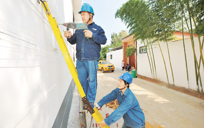 近日,国网河南孟州市供电公司组织技术人员深入槐树乡源沟村,对400伏下户线进行改造,增加设备容量,同时规整街道线路,进一步改善供电质量,提高供电可靠性,满足村民的生产生活用电需求。图为该公司员工在进行施工改造。