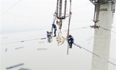 近日,在安徽省芜湖市天门山,电力工人拆除我国首批220千伏跨越长江输电线路——皖中大跨越导线及附件,今后5万吨级货轮可以从海上畅通无阻直达芜湖港。据了解,皖中大跨越于1958年开工建设,是安徽首条跨越长江向华东送电的重要通道。