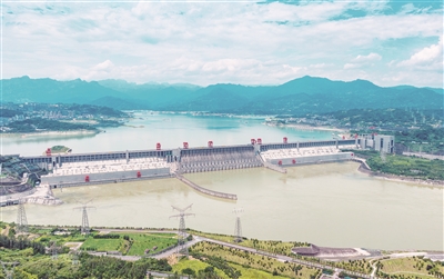 图为7月10日拍摄的长江三峡水利枢纽工程和右岸外送输电线路。人民图片