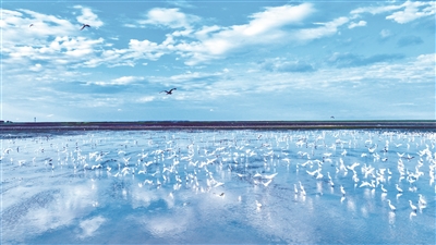 一阵风吹来,有鸟儿张开翅膀飞翔。似乎受到同伴召唤,“哗”的一声,其他鸟儿纷纷展翅,贴着水面起飞,在低空盘旋。瞬间,满目都是耀眼的白色,满耳都是鸟的轻唤、长吟、低鸣。有鸟群回旋起舞,有鸟群直奔苍空又俯冲直下,为滋养它们的一方水土增添了生命灵动。