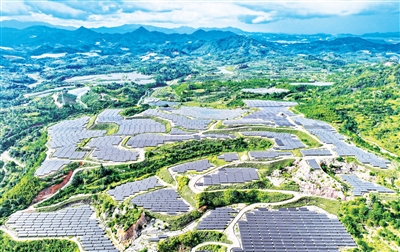 7月23日,在江西省赣州市寻乌县文峰乡柯树塘废弃矿山,连片的光伏发电设施与群峰、林田、花果、湖草交相辉映,构成一幅郁郁葱葱的生态画卷。