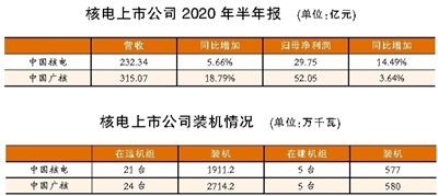 本报讯 实习记者赵紫原报道:中国核电、中国广核近日发布的2020年半年报显示,两家公司营收和归母净利润均实现增长。中国核电、中国广核分别实现营收232.34亿、315.07亿元,分别同比增长5.66%、18.79%;归母净利润29.75亿、52.05亿元,分别同比增长14.49%、3.64%。