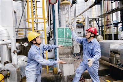 图为该厂有关人员对洗眼器、喷淋设施进行试水检查。