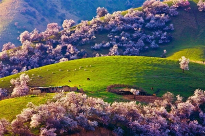 漫步杏花谷,近看,开花的野山杏树一身雪白或粉红,灿若云霞,仿佛走进一座时光的隧道。远观,百余里山坡成了梦中仙境,蜂蝶飞舞,牧人骑马,牛羊静卧溪边,狗吠毡房前,空气中氤氲着泥土的清香与花香,令人陶醉。