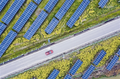 浙江省乐清市城东街道的正泰150兆瓦“农光互补”光伏发电项目占地约4500亩,仲春时节种植的油菜花陆续盛开,金黄色的油菜花与蓝色的光伏板交相辉映。