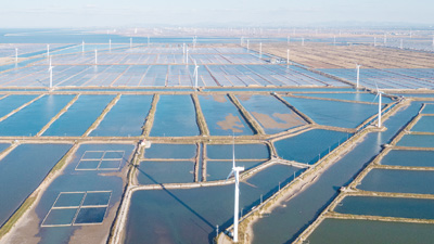 山东省昌邑市充分利用沿海风能资源优势,积极引进新能源开发企业在开阔滩涂盐田开发建设风力发电项目,输出运用绿色清洁能源,造福一方群众。图为日前昌邑市下营镇华能风电场,庞大的风车群在滩涂盐田上运行转动,场面壮观。