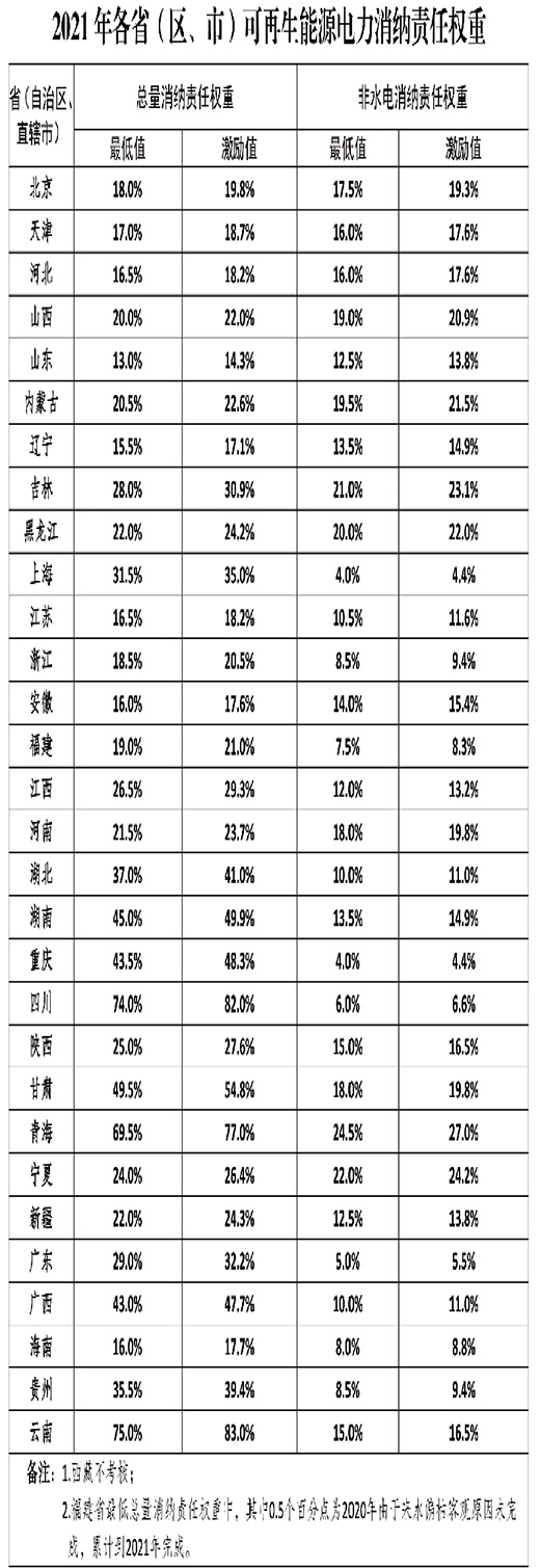 根据《通知》,从2021年起,每年初滚动发布各省权重,同时印发当年和次年消纳责任权重,当年权重为约束性指标,各省按此进行考核评估,次年权重为预期性指标,各省按此开展项目储备。