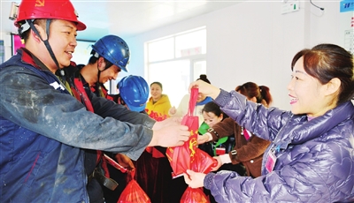 为进一步提升为职工服务的能力,把公司的温暖送到广大职工身边,近日,华亭煤业集团东峡矿工会开展了“亲情暖心筑平安”井口慰问活动,为上下井的矿工送上牛奶、苹果、香蕉、平安鞋垫、安全红腰带等慰问品,并叮嘱其将安全牢记于心,按章操作,安全生产。图为慰问现场。