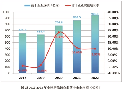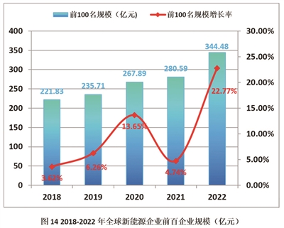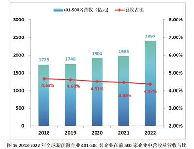 与百亿规模和400亿规模企业相比,401-500名企业的营业收入增长率最低,且在前500企业的营业收入占比逐年下滑,发展略显颓势。全球新能源企业头部企业竞争力优势强化趋势明显,赢者通吃的局面开始显现。