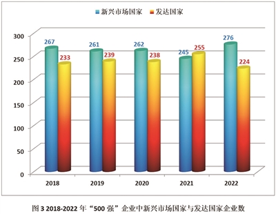 一是企业数上,对2022年500强分析,结果显示,前500的企业中,新兴市场国家企业达到276家(见图3),比上年的245家增加31家;而发达国家企业仅有234家,比上年的255家减少31家。
