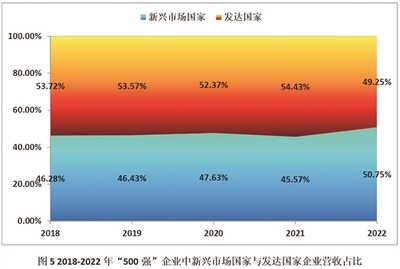 三是营业收入占比上,前500企业中,新兴市场国家企业的总营业收入占比达50.75%(见图5),比上年的45.57%大幅增加5.18个百分点,首次超过50%、超越发达国家企业;发达国家企业总营业收入占比则为49.25%,比上年的54.43%减少5.18个百分点。