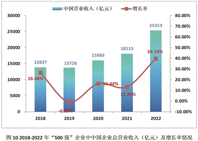 二是营业收入上,前500企业中,中国企业总营业收入达25313亿元,比上年的18115亿元增加7189亿元;营业收入增长39.74%,比上年的13.34%大幅增加26.4个百分点(见图10)。