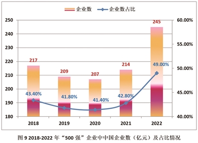 一是企业数上,前500企业中,中国企业数达245家,比上年的214家增加31家,占比达49%,比上年的42.8%增加6.2个百分点,多年维持在40%以上(见图9)。