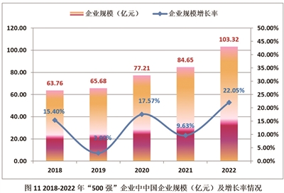 二是企业平均规模破百亿。以2022年500强为样本分析,结果显示,企业的平均规模达到了109.81亿元(见图2),首次突破100亿元大关,比上年的88.16亿元增加21.65亿元,增长24.56%。