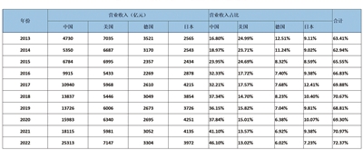 近年来,与其他大洲相比,亚洲企业在企业数、营业收入、前十企业等指标上都处于上升的态势,其优势也逐步确立,而欧洲企业则处下滑状态,颓势凸显。