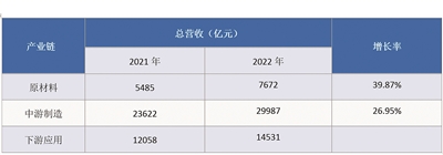 2022年,前500企业中,原材料企业的总营业收入达7672亿元,比上年的5485亿元增加2187亿元(见表5),增长39.87%;中游制造企业的总营业收入为29987亿元,比上年的23622亿元增加6365亿元,增长26.95%;下游应用企业的总营业收入为14531亿元,比上年的12058亿元增加2473亿元,增长20.51%。