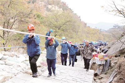 深秋时节,泰山深处温度较低、寒意正浓,但由于体力消耗大,电力工人们黝黑的脸上还是流出了细细的汗珠,中间每隔十几分钟就要休息一下。“因为无法使用机械,电缆敷设工作全部要依靠人力,大家肩扛手抬,在遇到拐弯、上陡坡等负重加重的区域,难度以及体力消耗还会进一步加大,需要整个团队齐心协力才能完成。”国网泰安供电公司项目管理中心第三业主项目部经理曹轶说。除此以外,当下正值山路上秋蚊子肆虐的时节,皮肤一旦露在外边就会立即被咬个大包,又痒又疼。