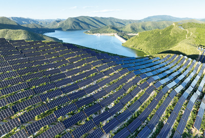 图为遍布在唐山丰润邱庄水库岸边的光伏板。 |