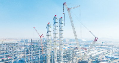 2月22日,位于固阳县金山工业园区的弘元能源科技(包头)有限公司项目建设现场,从高空俯瞰正在建设的精馏塔。 |