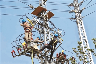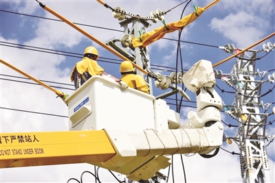 图为昆明禄劝供电局工作人员顶着高温开展带电作业,保障线路安全可靠供电。龙振江/摄 |