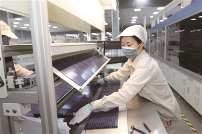 图为江苏省阜宁经济开发区的一家新能源企业生产车间内,工人正在赶制订单,满足市场。人民图片