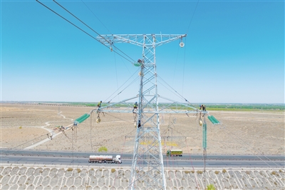 330千伏张驼一线203号至206号拉线V型塔不满足“三跨”管理要求,线路改造完成后,将进一步提高输电线路供电可靠性,为甘肃河西走廊地区的重要交通提供坚强电力保障,进一步推进电力与交通建设的融合发展。图为作业现场。