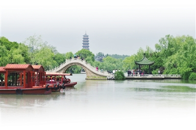 “水云胜概”是二十四景之一。胜概,指美好的境界。事实上,经过历代建园造景,逐步形成精美独特的湖上园林。“林外钟来知寺远,柳边人歇待船归。”品读一副柱对联,听大明寺的钟声隔空而来,余音不绝。