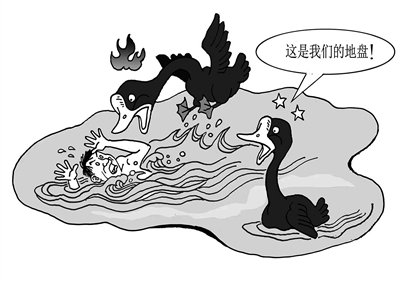 南京师范大学体育学院的一名男生在一个贴有禁止游泳警示牌的湖中游泳时,突然遭到湖中一只黑天鹅的猛烈攻击,而另外一只天鹅则在一边旁观。黑天鹅对男生又抓又咬,被吊打的男生最终无奈上岸,此时后背已满是伤痕。——不要擅闯“人家”地盘,否则休怪“铁翅无情”。 |