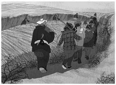三、日上三竿 西蒙终于发出了休息的口令:“吃锅烟” 掏出烟袋说:额给嚓谝个凾传(我给咱们聊个闲话) 大家不约而同面向沟壑,背靠硷畔 男生装烟锅、打火链、塞硝棉,只为尝一口呛人的旱烟 女生被随手摘来的酸枣酸得眯起了眼 西蒙嘴边升起的一缕青烟曼妙奇幻 嘴里吐出的传说更是石破惊天 |
