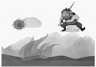 四、在很早很早之前的一天 太阳瞪着独眼,跟火球一般 孙猴儿心里不安手搭凉棚看人间 它簇簇鼻子 突然闻到不对劲,赶紧窜到地面 落地一看,额的天! 地面的烫土埋过小腿,把孙猴的沟子(屁股)烫得冒了烟 “乡亲们啊,大旱咋不早言传” 见不得百姓受苦受难,孙猴儿一个跟斗冲上天 |